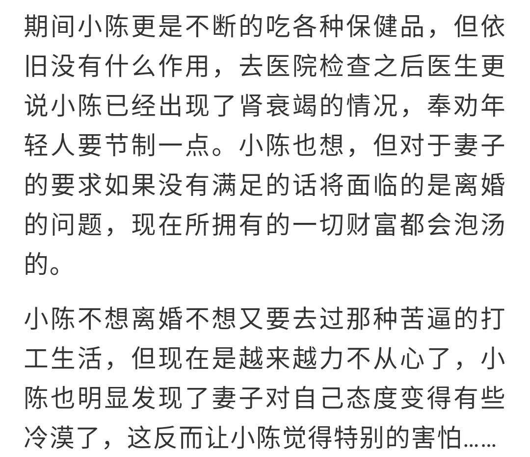 对于这件事情,你是怎么看的?很多网友纷纷表示小陈这是在找死的节奏,被人包养是要付出代价的,没有必要因为金钱而去牺牲自己的健康。可总有那么一些人为了钱可以不顾一切,不得不让人沉思,钱有那么重要吗?