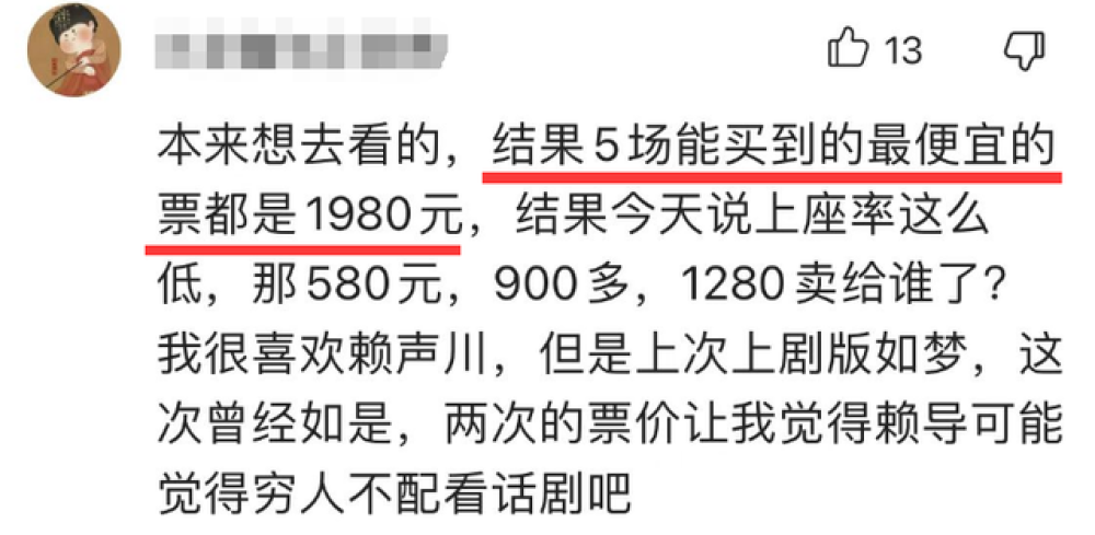 对于《曾经如是》首演遇冷的情况,有网友表示其主要原因是票价过高,5场能买到的最便宜的票都将近2000元,本以为这是因为销售火爆导致票价上涨,但事实并非如此。网友也质问580元、900多、1280元的票都卖给谁了?质疑背后是否有人操控光卖高价位票,而便宜一点的票不对外出售,如此高昂的票价自然让大部分人都难以接受。