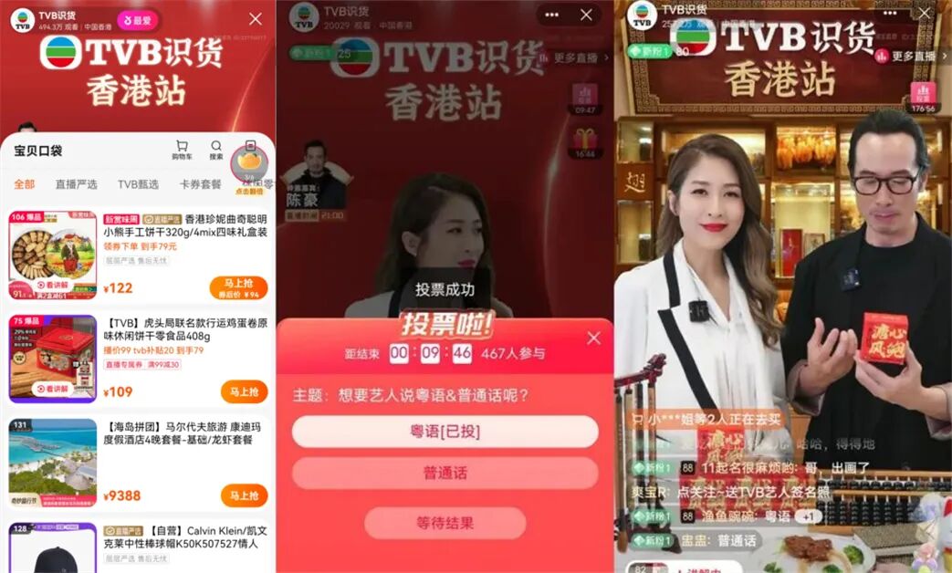回顾TVB首场直播,带给行业很多值得一提的点,比如整个布景融合了《溏心风暴》,如港风、粤语带来的情怀和个性化风格,还有视帝、花旦担纲直播。市场的期待也不难理解,“TVB超过400位明星,一天一个也能用一年多”类的评论声音不少。