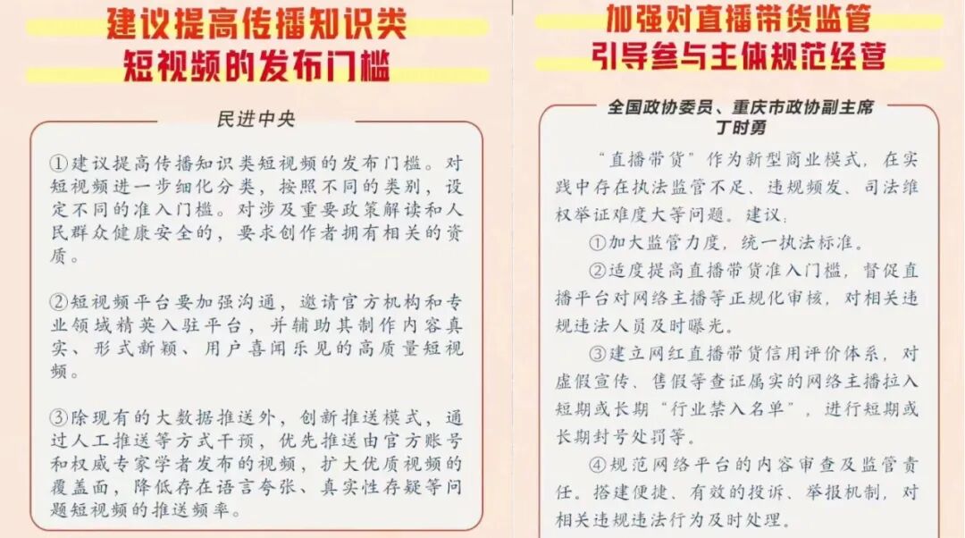 首先,短视频行业是提案的热门领域。比如,针对知识类短视频作品存在科普误导的现象,民进中央建议“提高传播知识类短视频的发布门槛短视频”,认为平台需邀请官方机构和专业领域精英入驻,且要降低存在语言夸张、真实性存疑等问题短视频的推送频率。