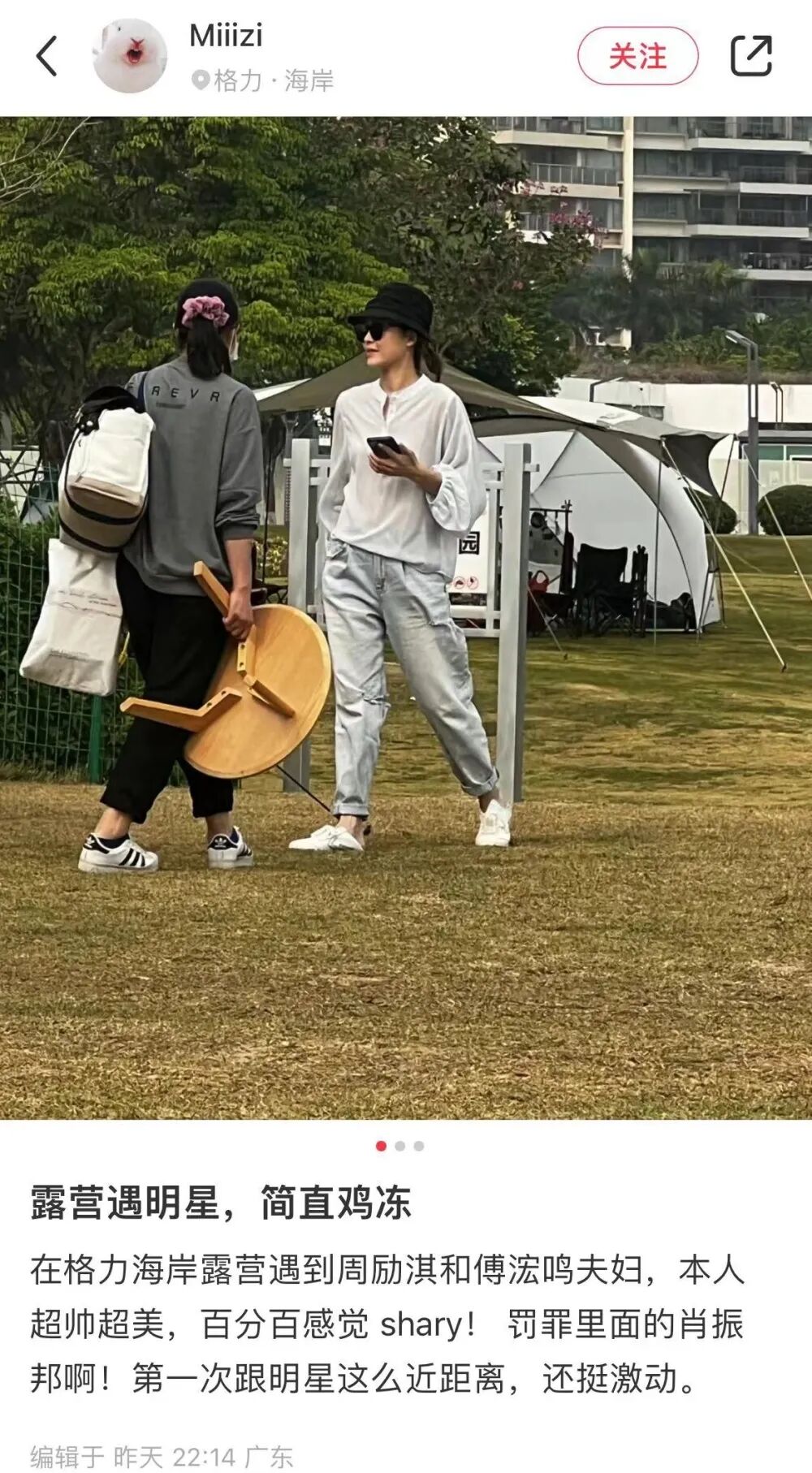 3月12日星期天,有网友发文透露在广东珠海的公园露营时,看到了来自香港的周丽淇(现改名为周励淇)夫妇,二人应该是带着孩子享受阳光。