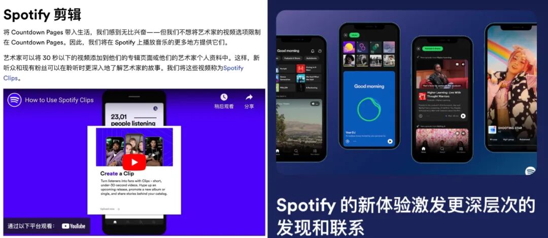 综合两个功能来看,尽管他们的共性是短视频化,但Spotify声称其迭代思路还是为“发现音乐”服务。作为全球最好用的“发现音乐”APP,这两项优化交互的设计或能帮助用户更全面了解新歌、新音乐人,助力星粉双方建立持久的互动联系。