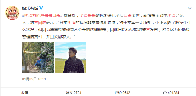 去年,著名男星明道的亲哥哥勒死妻儿后在树林中自杀离世。