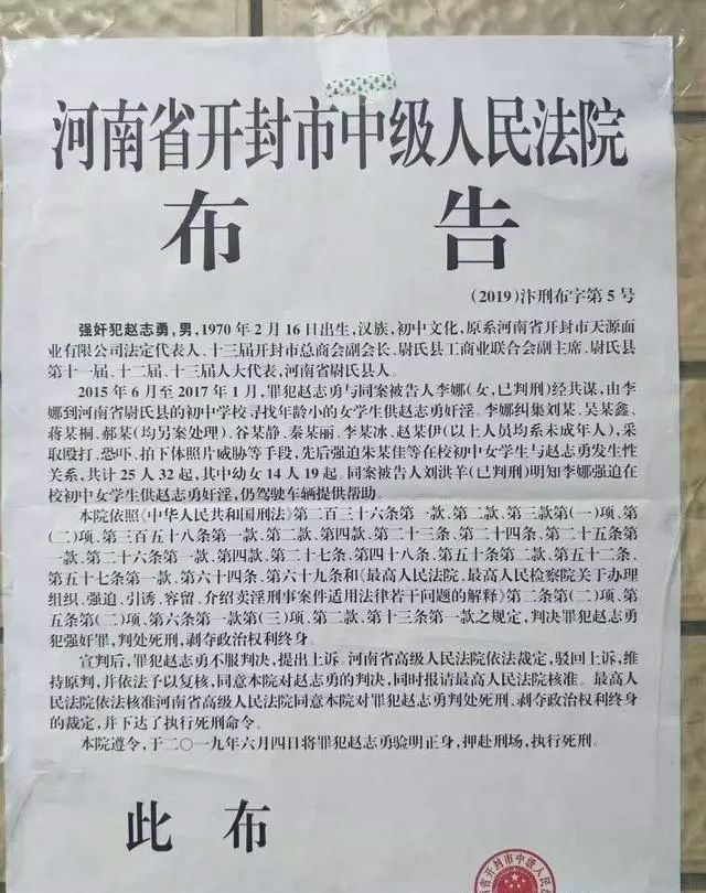 开封市中级人民法院6月4日发布布告,备受关注的河南省尉氏县“特大强迫卖淫案”强奸犯赵志勇已于当日被执行死刑。深一度记者从开封市中院办公室证实了上述消息。