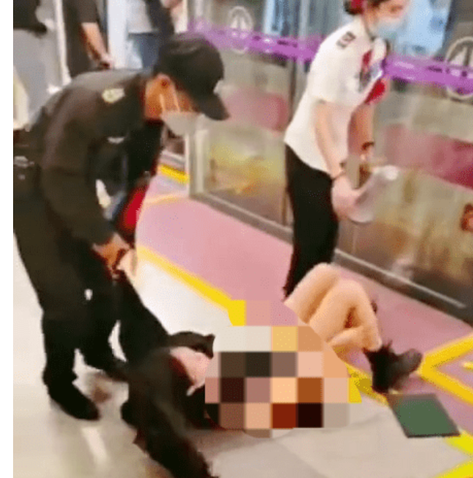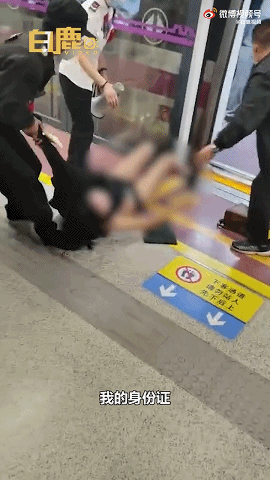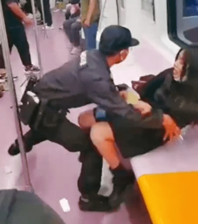 被地铁保安拖拽下车,拖出地铁时衣衫不整。